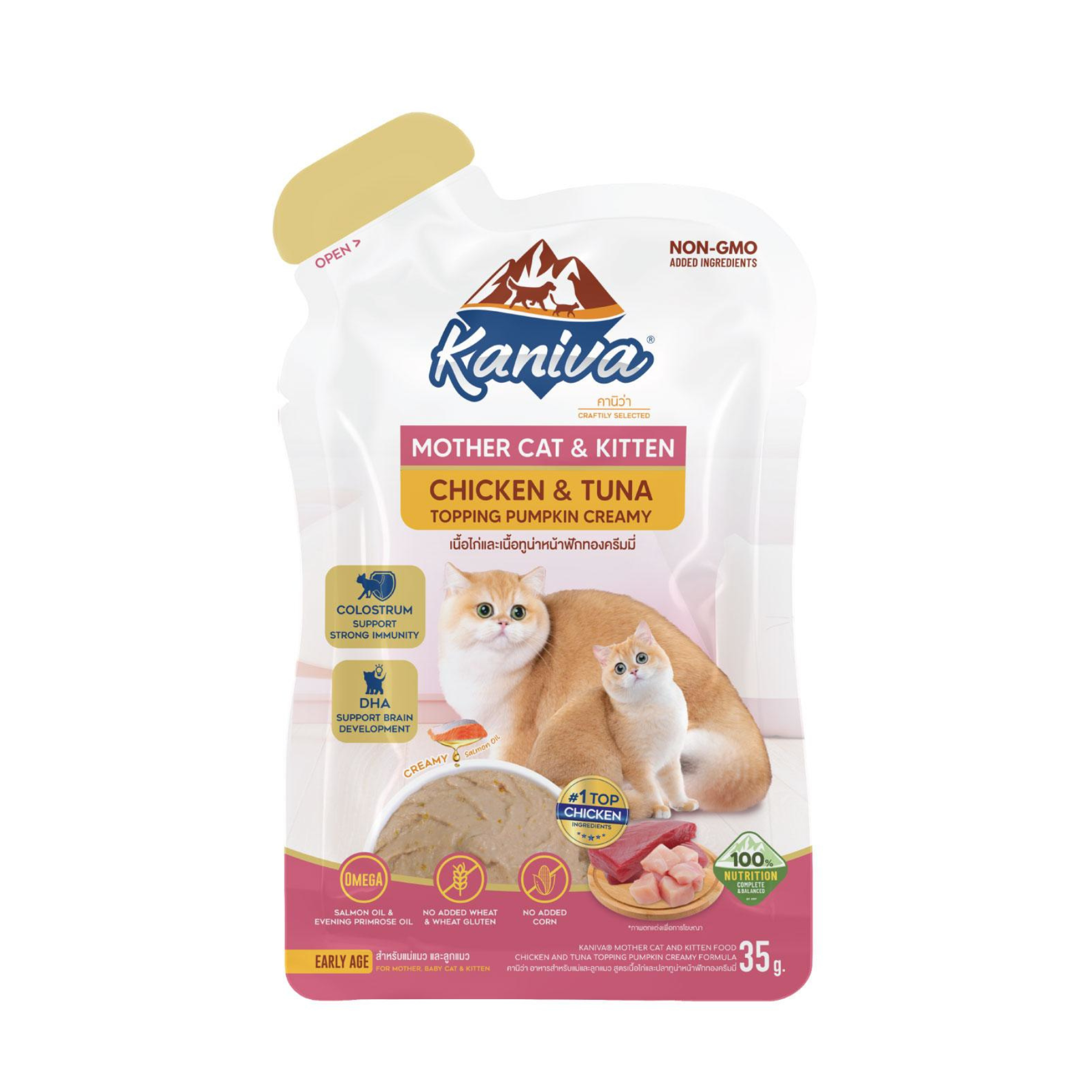อาหารแมวคานิว่าชนิดเปียก สูตรแม่แมวและลูกแมว เนื้อไก่และปลาทูน่าหน้าฟักทองครีมมี่