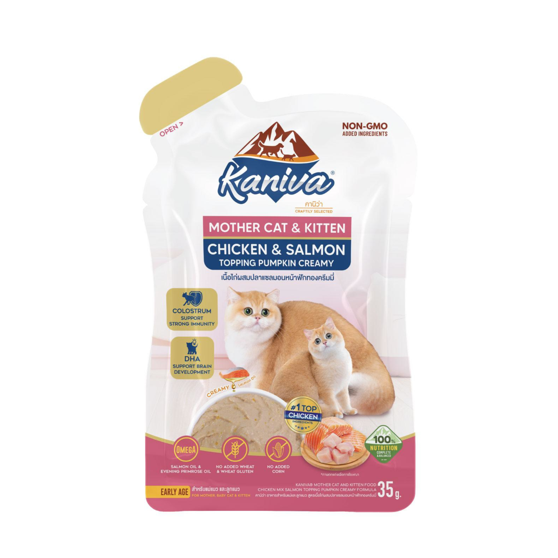 อาหารแมวคานิว่าชนิดเปียก สูตรแม่แมวและลูกแมว เนื้อไก่ผสมปลาแซลมอนหน้าฟักทองครีมมี่