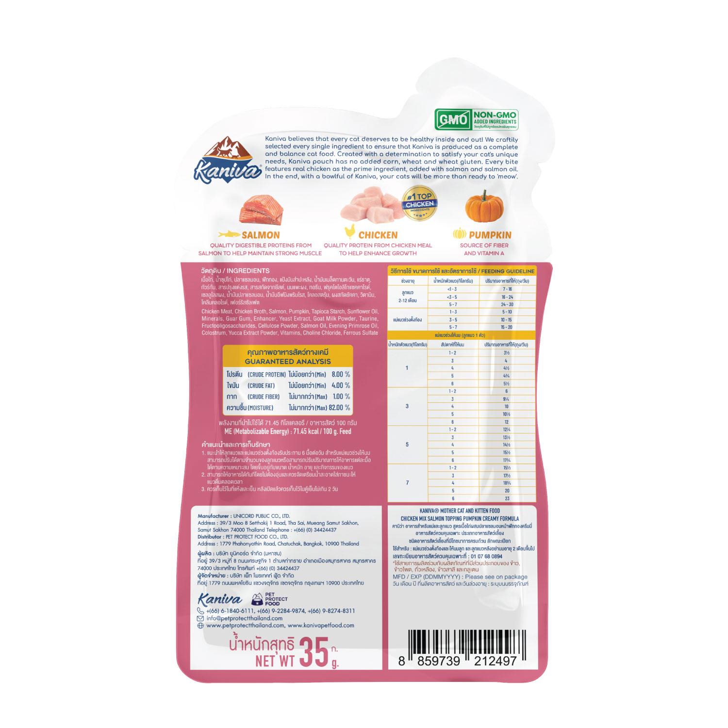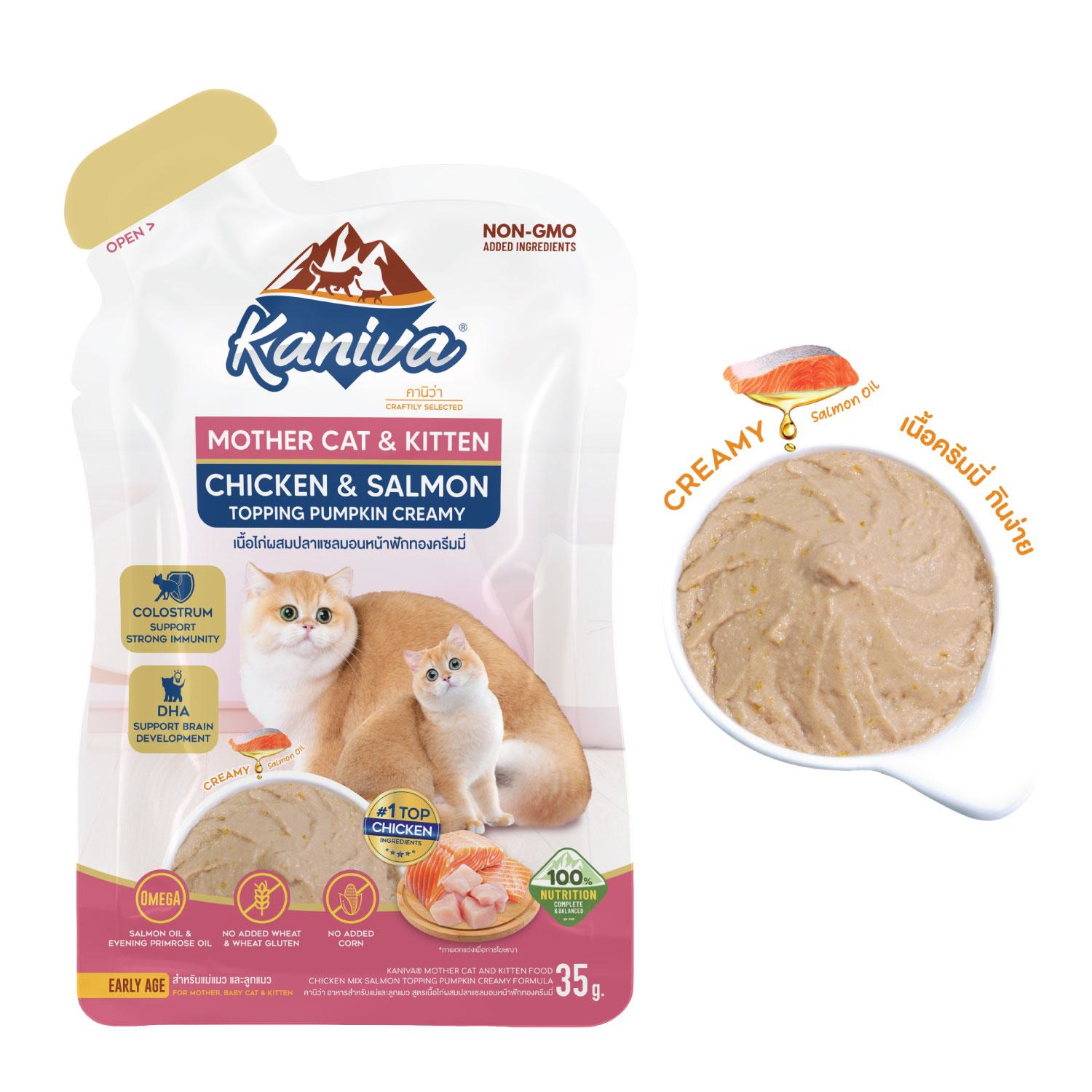 อาหารแมวคานิว่าชนิดเปียก สูตรแม่แมวและลูกแมว เนื้อไก่ผสมปลาแซลมอนหน้าฟักทองครีมมี่ อายุ 2 เดือนขึ้นไป