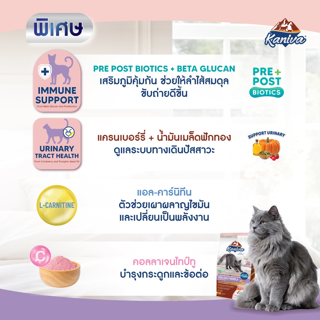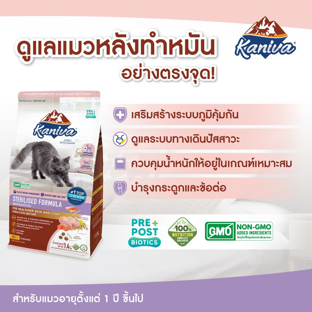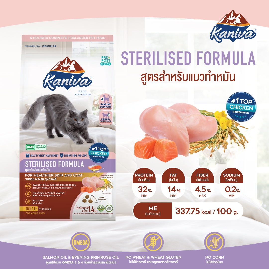 คานิว่าเชื่อว่าแมวทุกตัวควรมีสุขภาพที่ดีทั้งภายในและภายนอก! เราคัดสรรวัตถุดิบอย่างพิถีพิถัน ด้วยความมุ่งมั่นที่จะตอบสนองความต้องการเฉพาะตัวของแมวคุณ คานิว่า ไม่มีการเติมข้าวโพด ข้าวสาลี และกลูเตนข้าวสาลี เราใช้เนื้อไก่เป็นส่วนผสมหลัก เสริมด้วยปลาแซลมอนและข้าวอีกทั้งมีน้ำมันปลาแซลมอนและน้ำมันดอกอีฟนิ่งพริมโรส ซึ่งอุดมไปด้วยโอ เมก้า-3 และโอเมก้า-6 พร้อมด้วยวิตามิน แร่ธาตุ และสารอาหารที่จำเป็นช่วยเสริมสร้างระบบภูมิคุ้มกันให้แข็งแรง ควบคุมน้ำหนักให้อยู่ในเกณฑเ์หมาะสม และสนับสนุนสุขภาพ ระบบทางเดินปัสสาวะ สำหรับแมวทำหมัน สำหรับแมวอายุ 1 ปีขึ้นไป