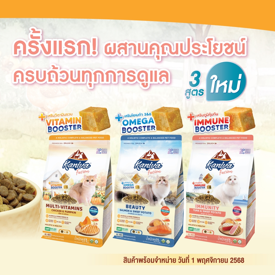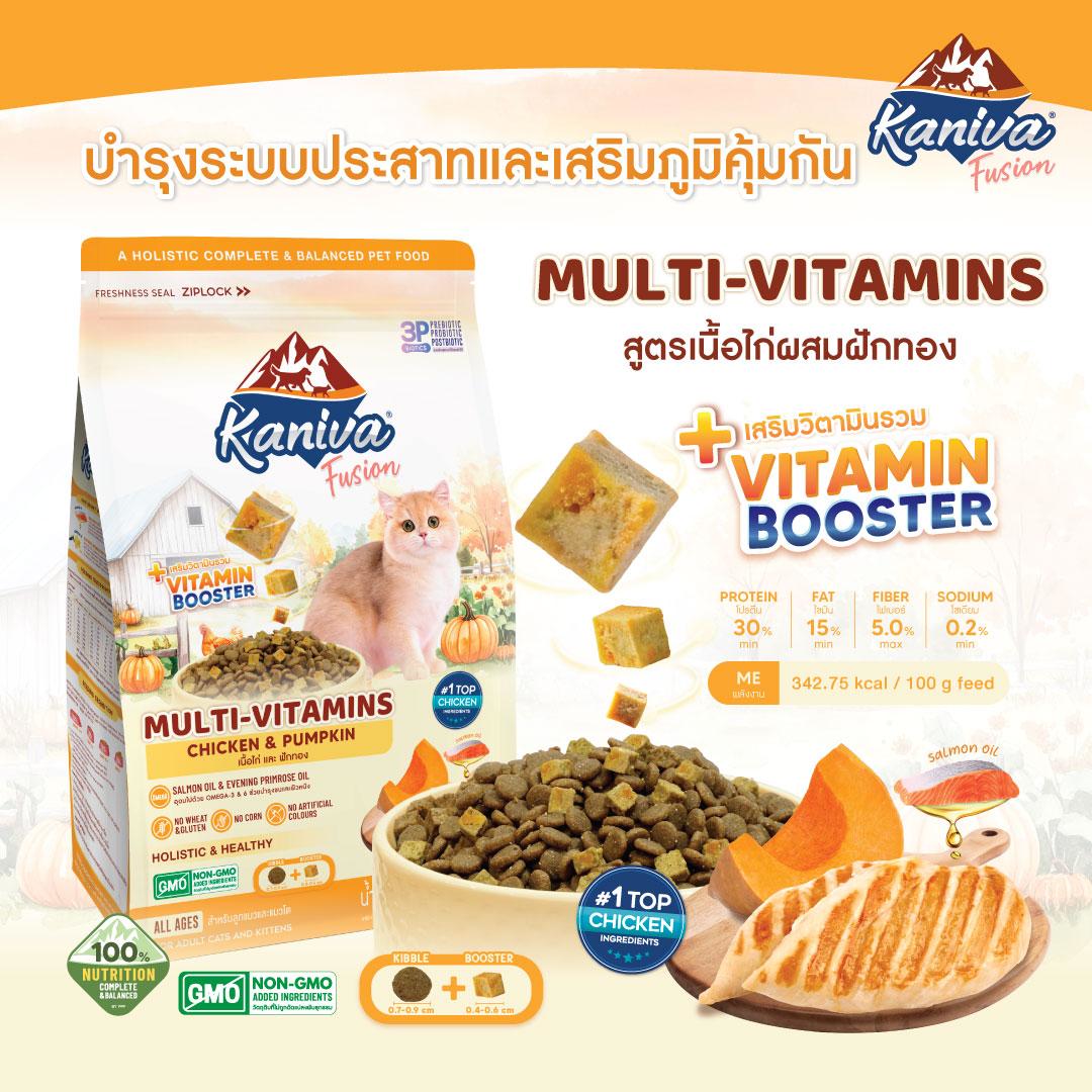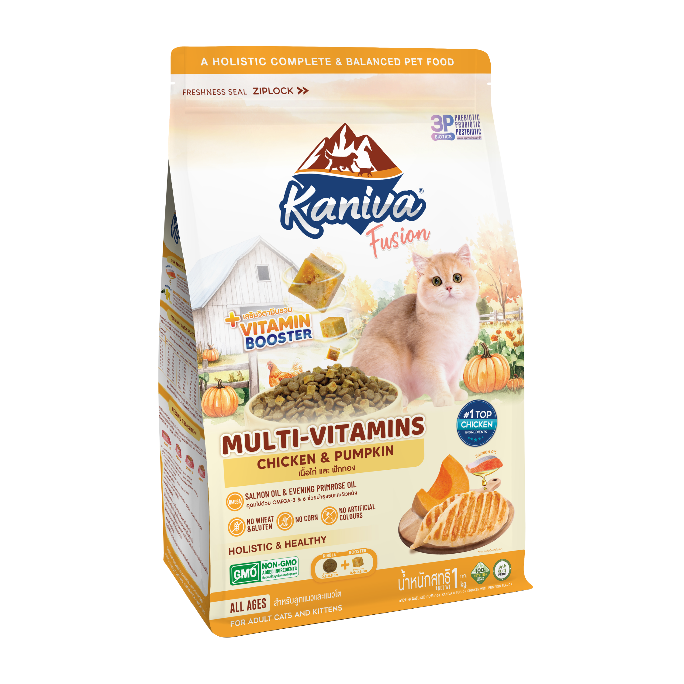 คานิว่า ฟิวชั่น รสไก่กับฟักทอง สูตรมัลติวิตามินและวิตามินบูสเตอร์ ช่วยบำรุงสมองและระบบประสาท สําหรับแมว อายุ 4 เดือนขึ้นไป