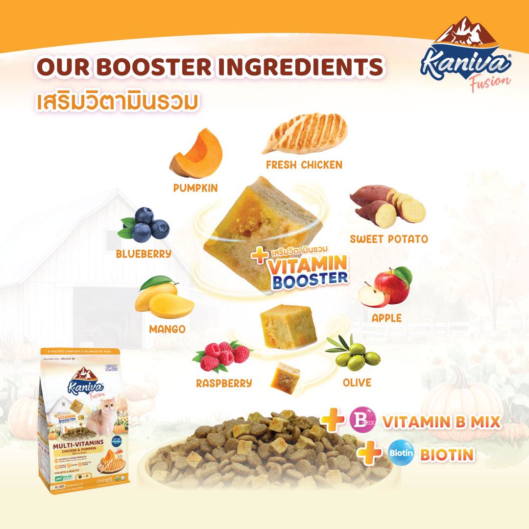 เนื้อสัตว์ปีกป่น (ไก่), ข้าว, กากถั่วเหลือง, มันสําปะหลัง, เนื้อไก่อบแห้ง (เนื้อไก่, ผลพลอยได้จากสัตว์ปีกป่น, กากถั่วเหลือง, โปรตีนถั่วเหลือง, ฟักทอง, ไขมันไก่, แป้งมันฝรั่ง, ยีสต์สกัด, มันเทศ ผง, แอปเปิ้ลผง, บลูเบอร์รี่, มะม่วง, ราสป์เบอร์รี่, เบต้ากลูแคน, อินูลิน, โพรไบโอติก (บาซิลลัส ซับฟิลิส), วิตามิน วิตามินบี1, วิตามิรบี2, วิตามินบี6, วิตามินบี12), วิตามินซี, ไบโอติน, มะกอก ผง, มะกอกผง), ไขมันวัว, ปลาป่น, ไก่ผ่านกระบวนการไฮโดรไลเซท, สารปรุงแต่งกลิ่นรส, นํ้ามันปลาแซลมอน, ไขมันไก่, เซลลูโลสผง, วิตามิน (วิตามินเอ, วิตามินดี3, วิตามินซี, วิตามินซี, กรด นิโคฟินิก, วิตามินบี1, วิตามินบี6, กรดแทน ทรีนิค, วิตามินบี2, วิตามินเคร, กรดโฟลิก, ไบโอติน, วิตามินบี12), แร่ธาตุ (เหล็ก, สังกะสี, ทองแดง, แมงกานีส, ไอโอดีน, ซีลีเนียม), โคลีน คลอ ไรด์, เมล็ดไซเลียมฮัสค์ผง, ไข่ผง, นํ้ามันเมล็ดทานตะวัน, นํ้ามันคาโนลา, ทอรีน, แอล-ไทโรซีน, เมไทโอนีน, เลซิทิน, ฟักทองผง, แครนเบอร์รี่ผง, นํ้ามันดอกอีฟนิ่งพรีมโรส, แมงกานีส อะมิโนแอ ชิค คอมเพล็กซ์, ชิงค์ อะมิโนแยชิค คอมเพล็กซ์, คอปเปอร์อะมิโนแอซิดคอมเพล็กซ์, โพแทสเซียม ไอโอไดด์, องค์-แอล-ซี ในเมทไธโอนีน คอมเพล็กซ์, แมนแนนโอลิโกแซคคาไรด์, โพรไบโอติก (บาซิลลัส ซับทิลิส), เอนไซม์, สารถนอมคุณภาพอาหารสัตว์ (กรดโพรพิโอนิก), สารปรุงแต่งอาหารสัตว์ (ไฮเดรต โวเทียม แคลเซียม อะลูมิเนียม ซิลิเกต, เอสเทอร์ไฟ กลูโคแมนแนน), กระดูก อ่อนปลายลม, สารสกัดจากควิลราจา ซาโปนาเรีย, สารสกัดยัคคาชิดิเจอร่า