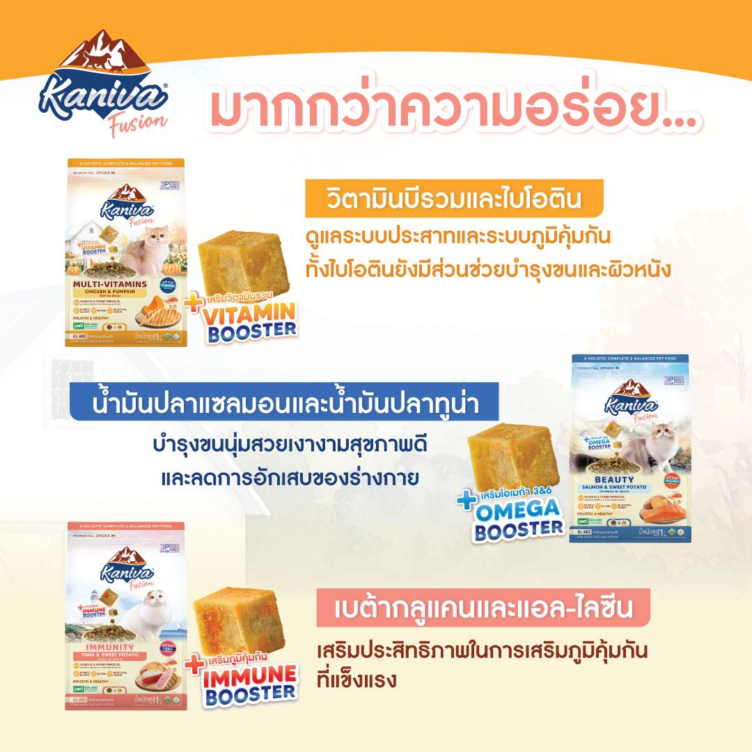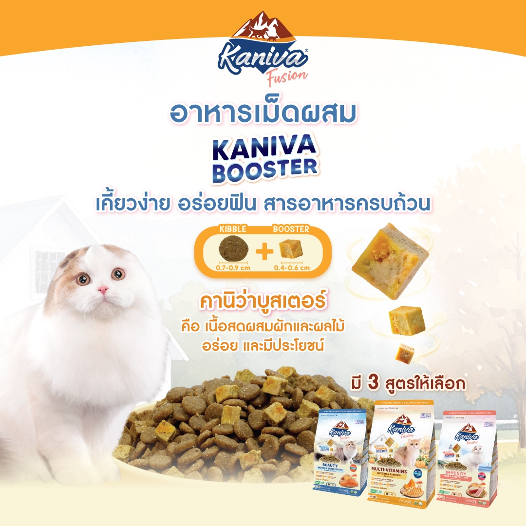 คานิว่าเชื่อว่าแมวทุกตัวควรมีสุขภาพที่ดีทั้งภายในและภายนอก เราคัดสรรวัตถุดิบอย่างพิถีพิถัน ด้วยความมุ่งมั่นที่จะตอบสนองความต้องการเฉพาะตัวของแมวคุณ คานิว่าฟิวชั่น ไม่มีการเติมข้าวโพด ข้าวสาลี และกลูเตนข้าวสาลี เราใช้เนื้อไก่เป็นส่วนผสมหลัก เสริมด้วยฟักทองและวิตามินบูสเตอร์สูตรพิเศษของคานิว่าที่ช่วยเสริมวิตามินรวมอีกทั้งมีน้ำมันปลาแซลมอนและน้ำมันดอกอีฟนิ่งพริมโรส ซึ่งอุดมไปด้วยโอเมก้า-3 และโอเมก้า-6 พร้อมด้วยวิตามิน แร่ธาตุ และสารที่จำเป็นสำหรับแมว ช่วยเสริมสร้างสุขภาพโดยรวมของแมว สำหรับแมวอายุ 4 เดือนขึ้นไป