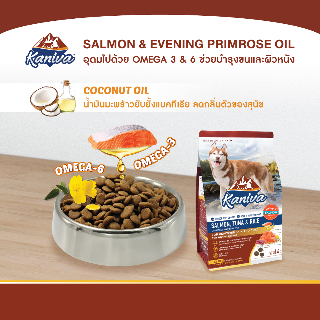 อาหารสุนัขคานิว่า สูตรเนื้อปลาแซลมอน ปลาทูน่าและข้าว เพื่อขนนุ่ม สวย เงางาม